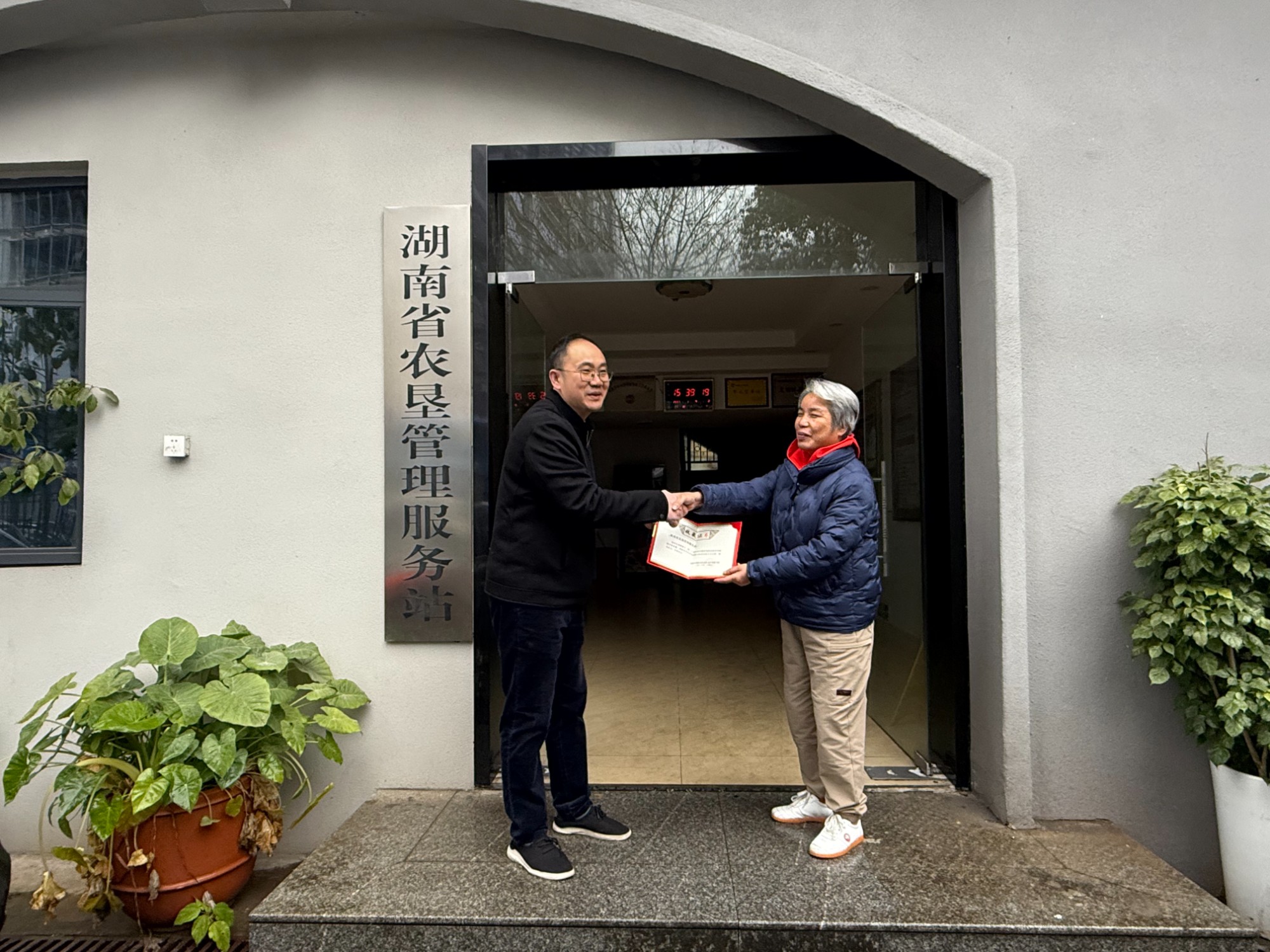 图书馆馆长刘爱民、科技处副处长何君及图书馆工作人员前往湖南省农垦管理服务站接收捐赠,并举行了简短的赠书仪式。仪式上,刘爱民向捐赠单位代表及谢雨桥女士颁发了捐赠证书,并对他们的慷慨捐赠表达了衷心的谢意,同时,对科技处的统筹协调与资源对接工作表示诚挚感谢。